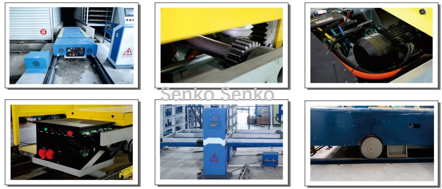 Le servomoteur entraîne les roues de la chenille transversale. La chenille longitudinale de la navette peut être alignée avec les chenilles longitudinales pré-intégrées suivantes : la chenille de sortie des briques humides de la machine à briques, la chenille d’entrée de l’empileur de briques, les chenilles de chaque four de séchage et la chenille de retour/livraison des palettes. Après alignement, le chariot de transport peut entrer et sortir de la navette.