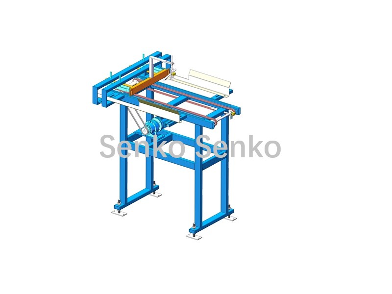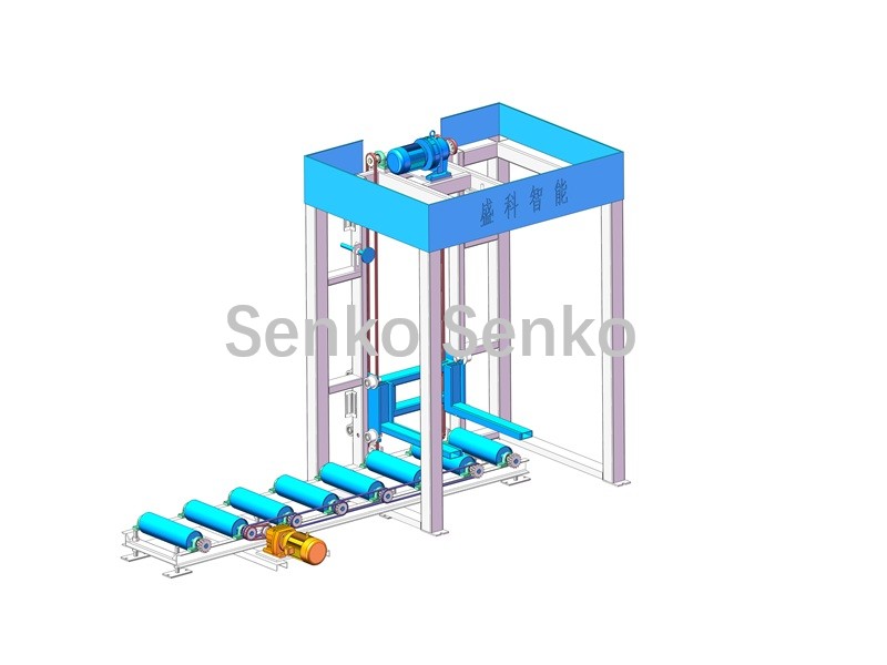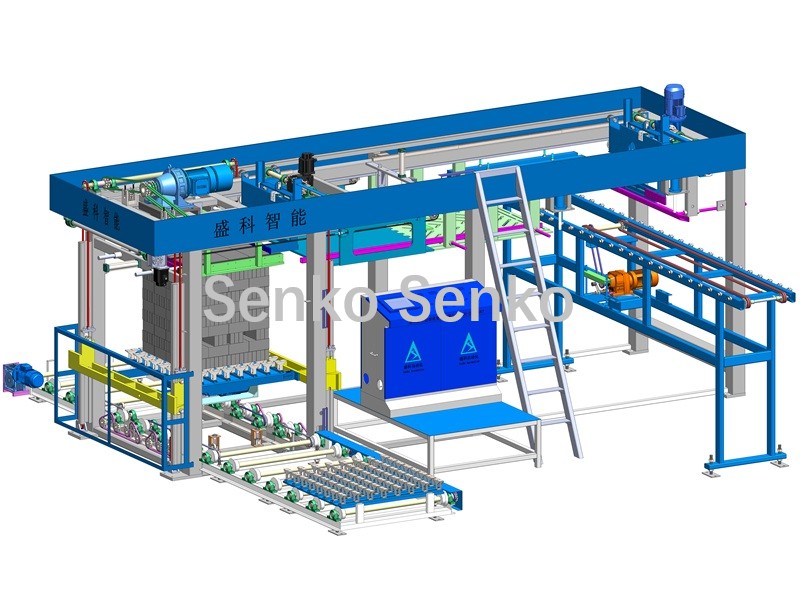 Le poussoir 3 pousse les briques/blocs alimentés vers le plateau de palettisation. Ce dernier avance jusqu'à la position d'empilage, puis le poussoir 4 descend et arrête les briques/blocs sur le plateau. Le plateau se retire alors, et les briques/blocs tombent et s'empilent successivement, formant ainsi une palette. Le poussoir 4 est commandé par un servomoteur, ce qui permet de réserver les emplacements pour chariot élévateur. Une fois la palette formée, il descend jusqu'au fond, où des rouleaux acheminent la palette de briques empilées vers le cerclage horizontal et vertical, puis l'emballage avec des feuillards en acier et en plastique PET.