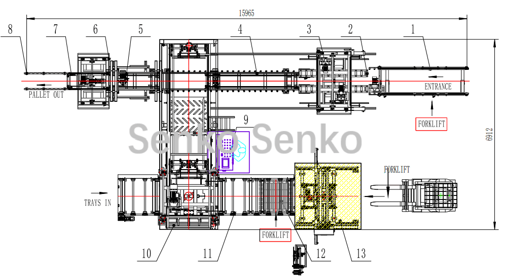 | 11. Plateau empilable | 12, Convoyeur à plateaux | 13. Machine d'emballage/de déballage |