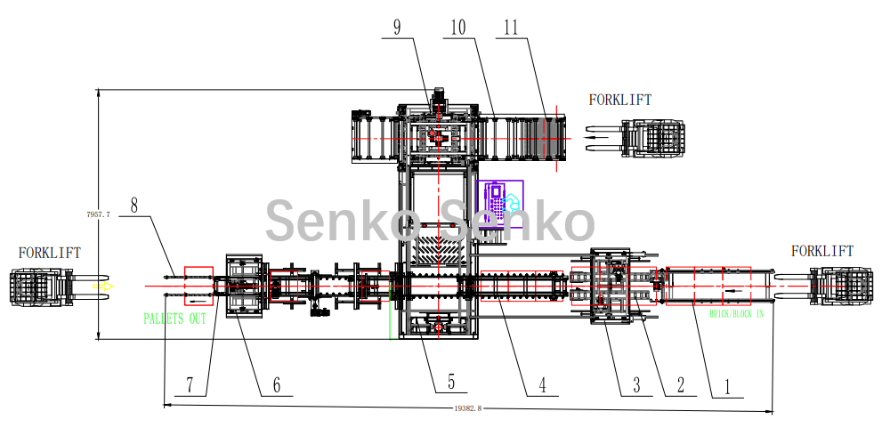 Les palettes de briques/blocs durcis, acheminées par chariot élévateur, sont transportées vers la zone de stockage des palettes. L'engin de levage saisit les palettes de briques couche par couche, par l'avant et par l'arrière, et les envoie sur le convoyeur avant le déconditionnement des palettes.