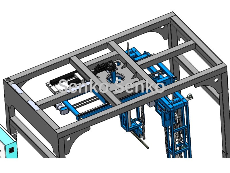 Cette unité intègre l'alimentation, le serrage et la coupe du feuillard par servomoteur, ainsi qu'un système de collage par friction rotative à grande vitesse. Elle peut atteindre une force de cerclage de 300 kN et se déplace verticalement pour s'adapter à différentes hauteurs d'empilage.