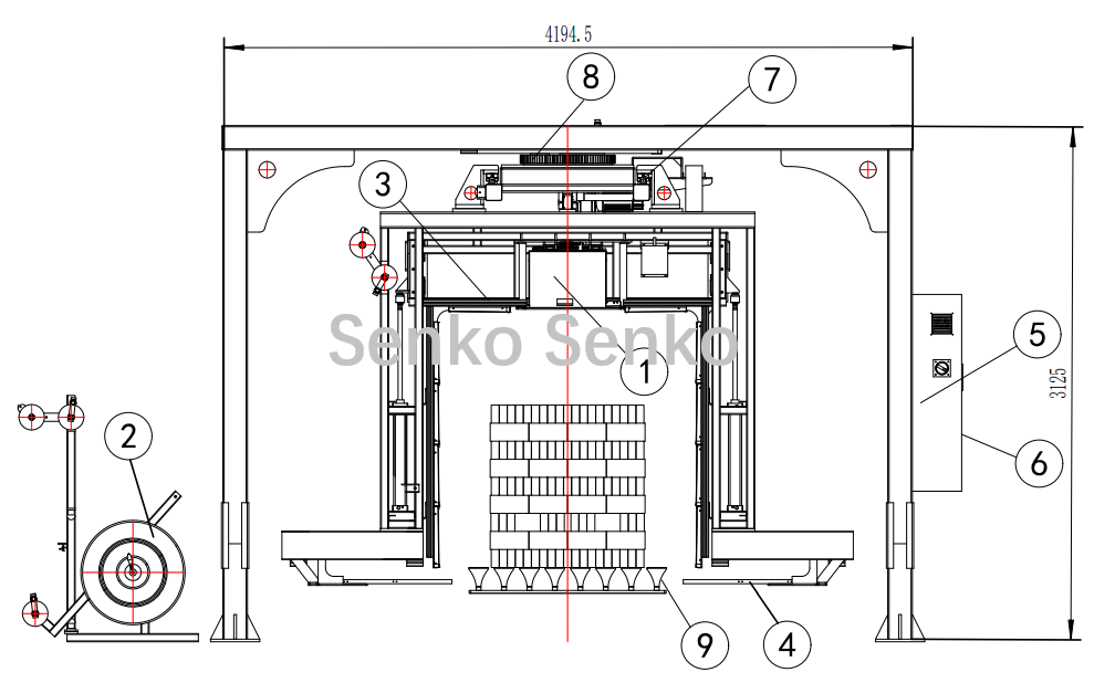 La cercleuse à rotation supérieure et à perforation par lame est un dispositif automatisé conçu spécifiquement pour les briques et les blocs. Elle combine astucieusement les technologies de rotation supérieure et de perforation par lame pour cercler efficacement et en toute sécurité les piles de briques. La tête de la machine (mécanisme de cerclage) se déplace verticalement le long d'un rail, s'adaptant ainsi aux différentes hauteurs d'empilement. Simultanément, un mécanisme en forme de tige, appelé « lame », traverse avec précision l'espace situé sous la palette, d'un côté de la machine, et travaille de concert avec la tête de la machine pour réaliser l'enroulement du feuillard, formant ainsi un cerclage en croix autour de la pile de briques.