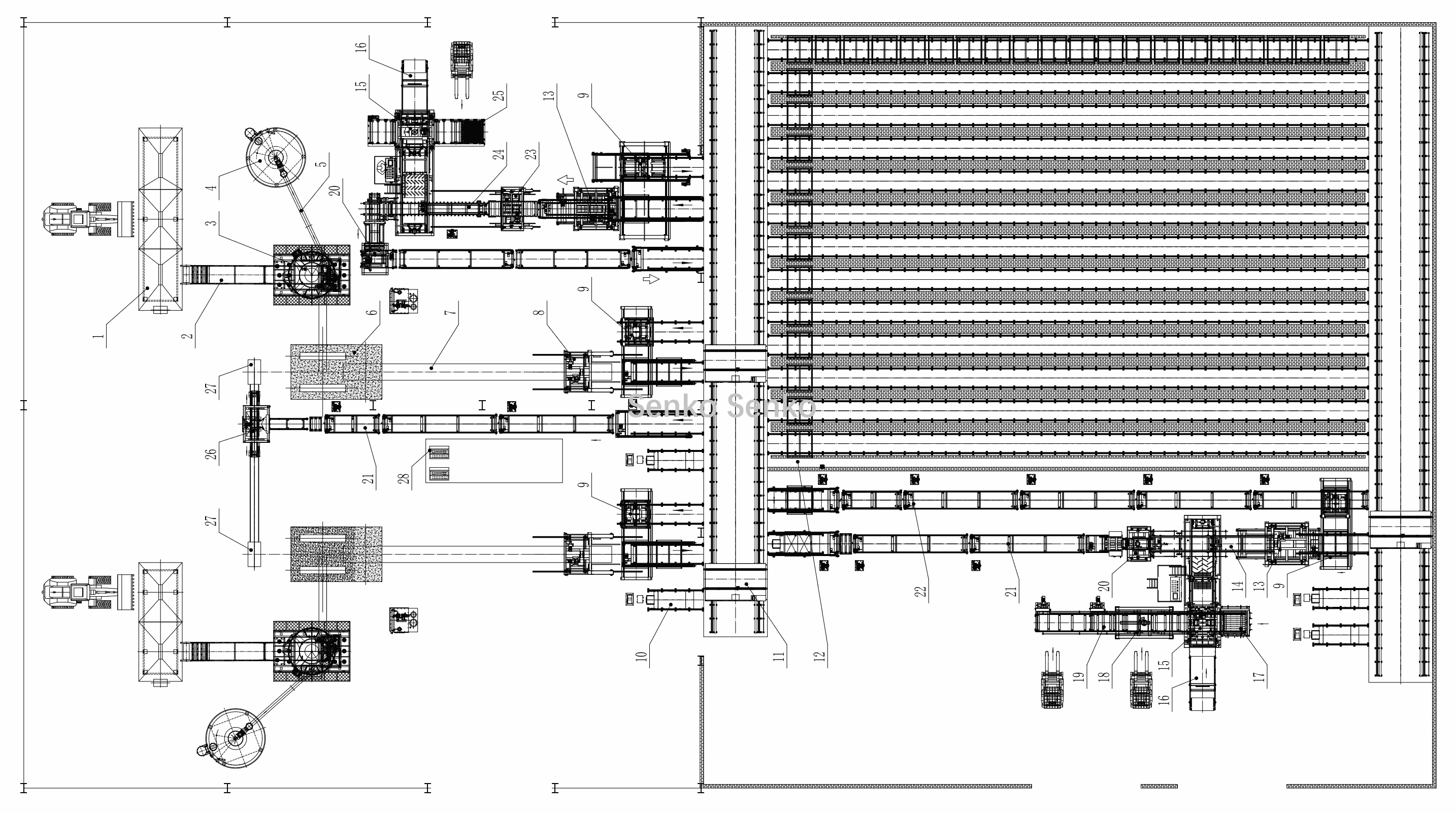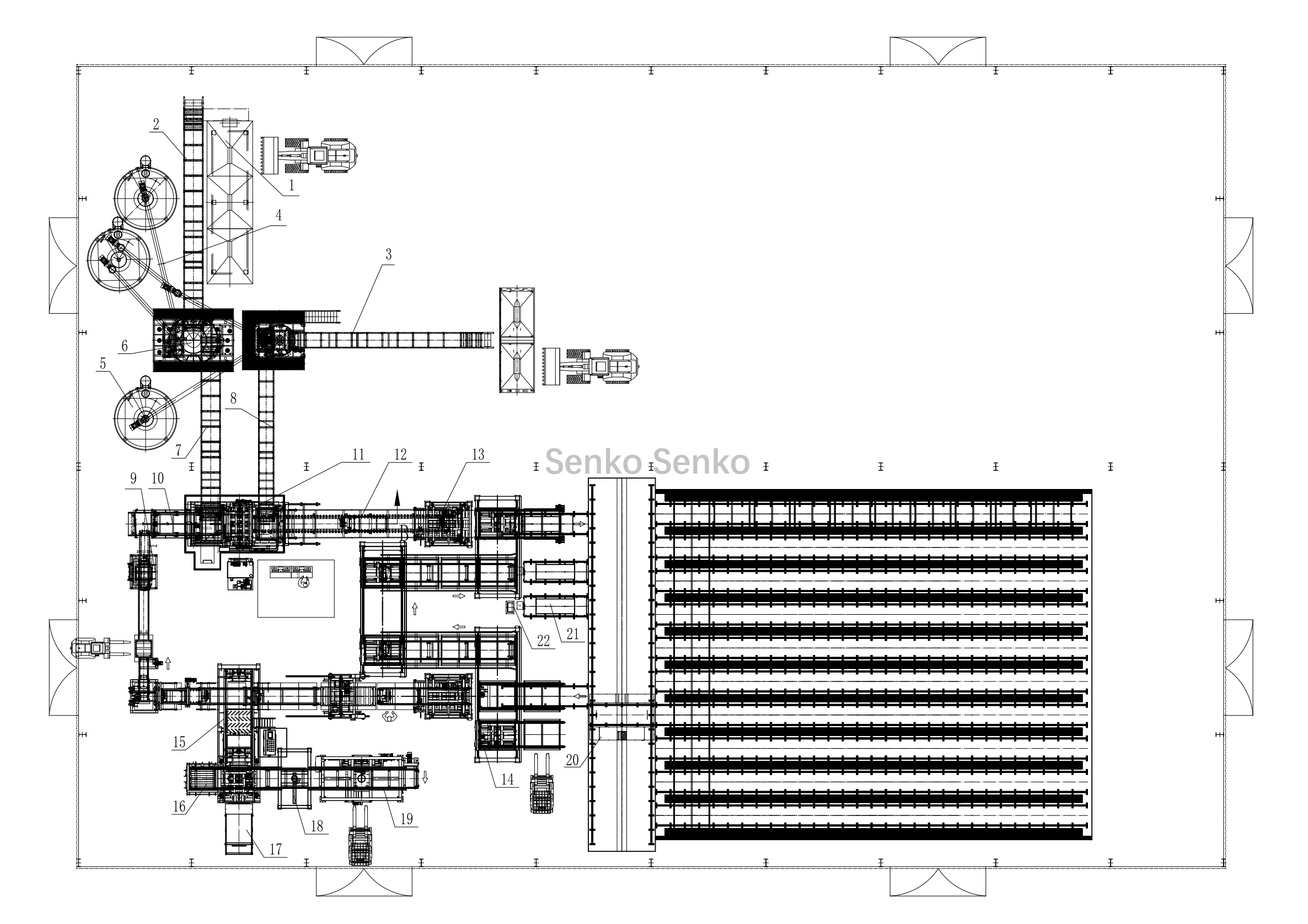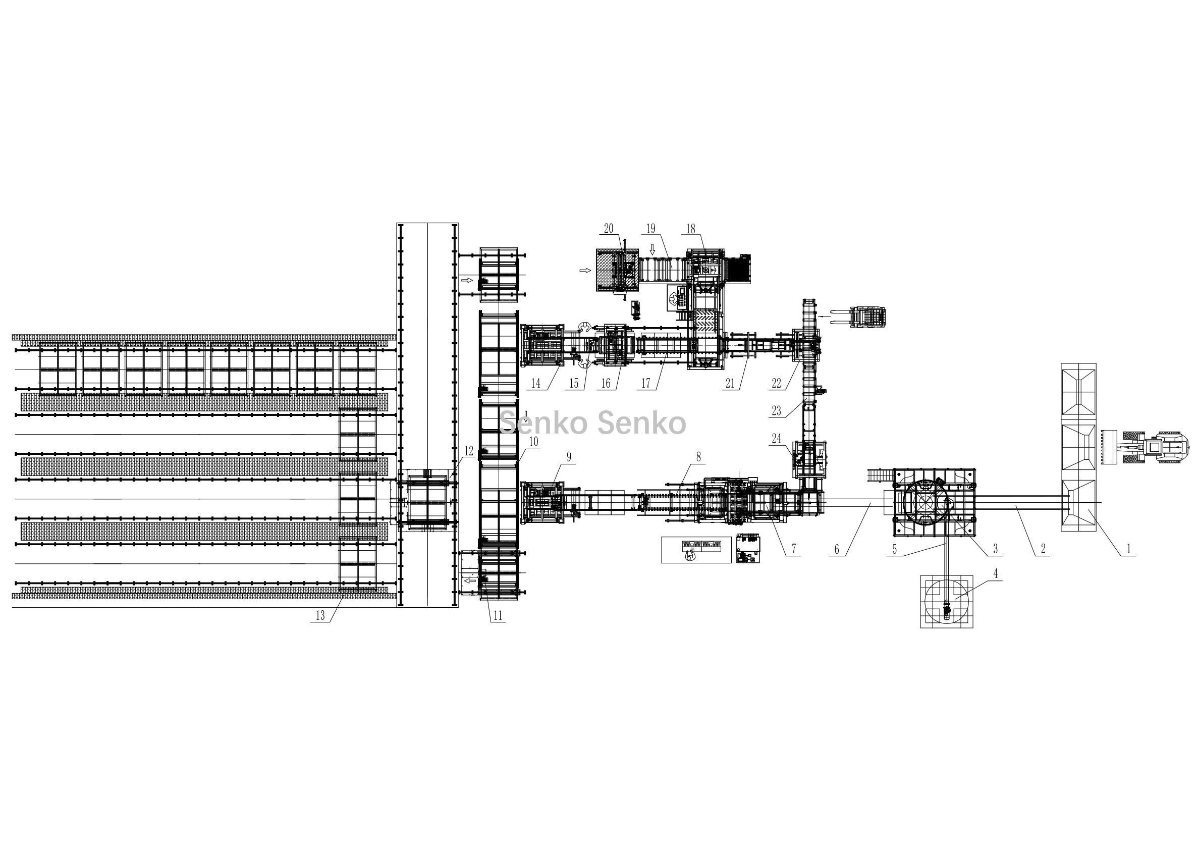 | 19, Machine à dénuder | 20, Palettiseur vide | 21, Convoyeur à palettes | 22, Convoyeur à rack vide | 23, Élévateur à palettes Brick | 24, Convoyeur de palettes de briques |
